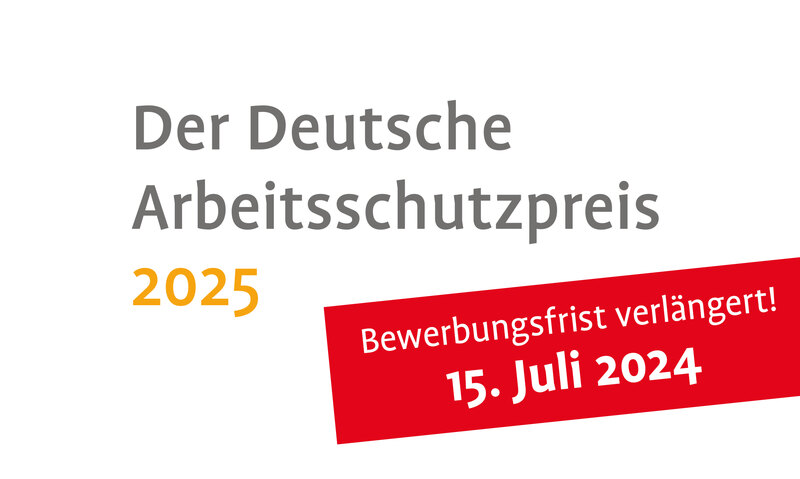 Noch bis einschließlich 15. Juli 2024 ist die Bewerbung für den Deutschen Arbeitsschutzpreis (DASP) 2025 möglich. Die branchenübergreifende Auszeichnung für vorbildliche strategische, betriebliche, kulturelle und persönliche Lösungen rund um Arbeitssicherheit und Gesundheitsschutz der Beschäftigten ist mit einem Preisgeld in Höhe von jeweils 10.000 Euro in vier Kategorien dotiert. In Deutschland ansässige Unternehmen aller Größen und Branchen sowie Einzelpersonen können sich unter www.deutscher-arbeitsschutzpreis.de bewerben. Die Preisverleihung findet am 26. Februar 2025 im Kongresszentrum des Bundes in Berlin statt.